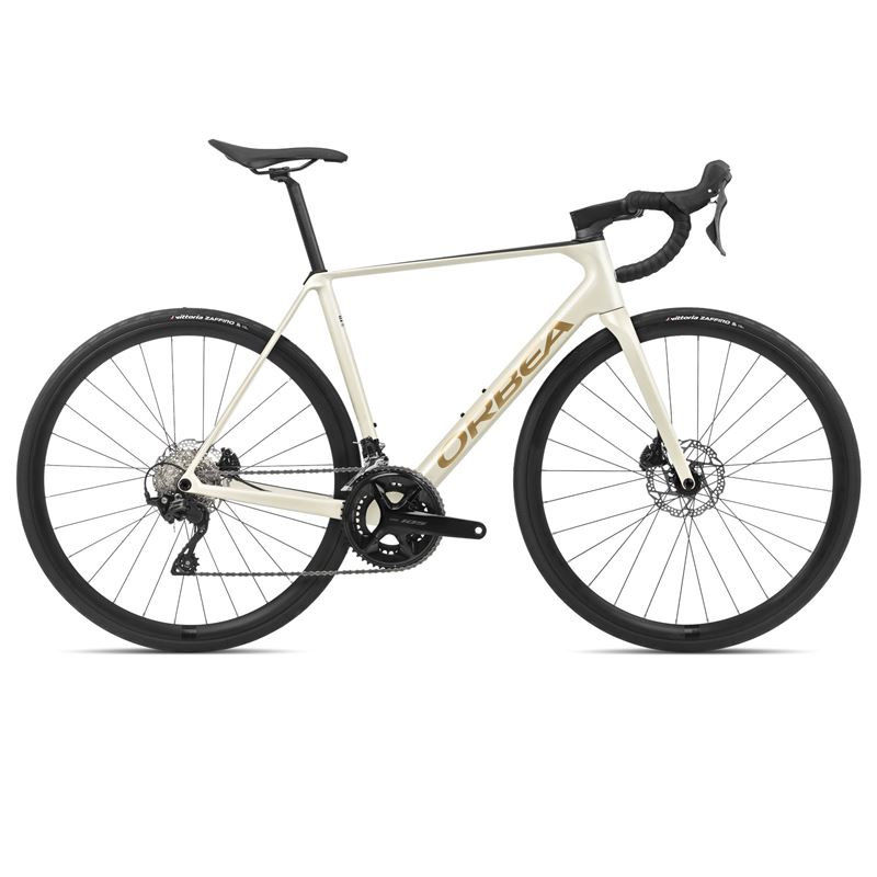 Bicicleta de carretera Orbea con cuadro de carbono, transmisión Shimano 105 R7000 GS de 11 velocidades y freno de disco Shimano R7070 hidráulico.