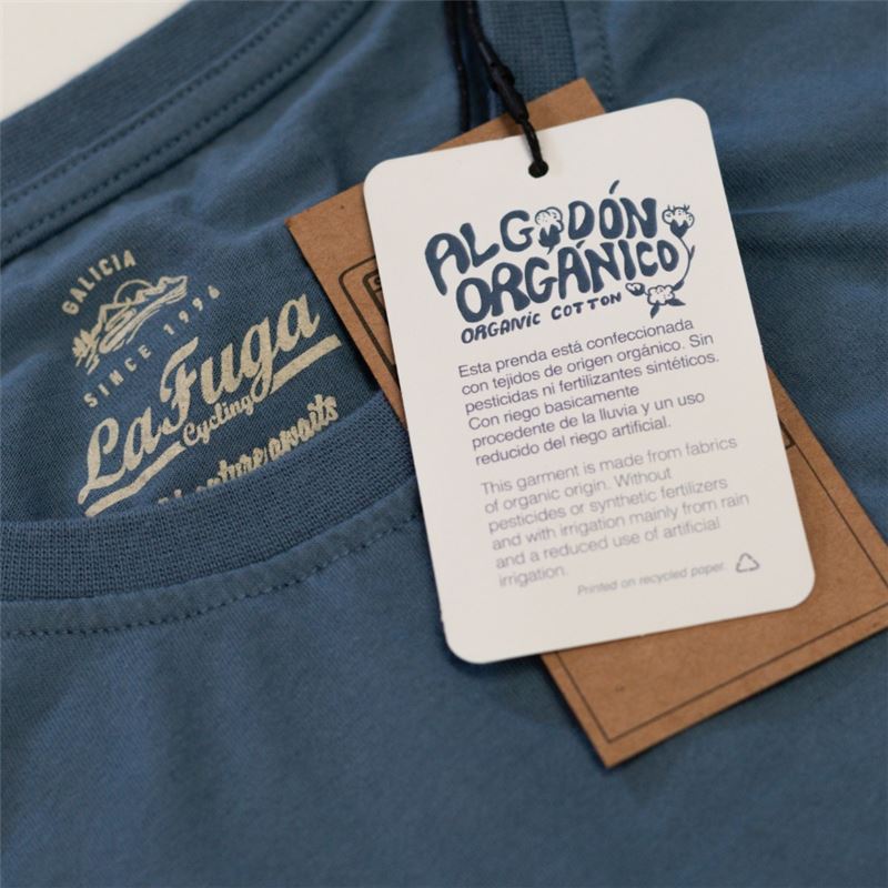 Esta camiseta está hecha de algodón orgánico, lo que garantiza una mayor calidad y suavidad, además de respetar el medio ambiente y la salud de las personas. Además, tiene un diseño único y original, con logos en tinta al agua y biodegradable, simulando corrosión, con el logo icónico de las montañas y paisajes de Galicia, donde montamos en bicicleta; y el año 1996, año de fundación de nuestra marca.